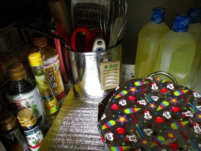 こちらも、シンク下です、油類や毎日は使わない調理器具などをまとめて立てて収納しています、揚げ物をする際に、すぐに取り出せるように揚げ物鍋は、手前にしていますが、中の油が少しでも、ほこりや劣化を防げるように、アルミホイルなどをかぶせています、中心に見える、BIOと書いている箱のようなものは、バイオシンク下のかびきれいとゆう商品で、かび防止になるようなので、使用しています