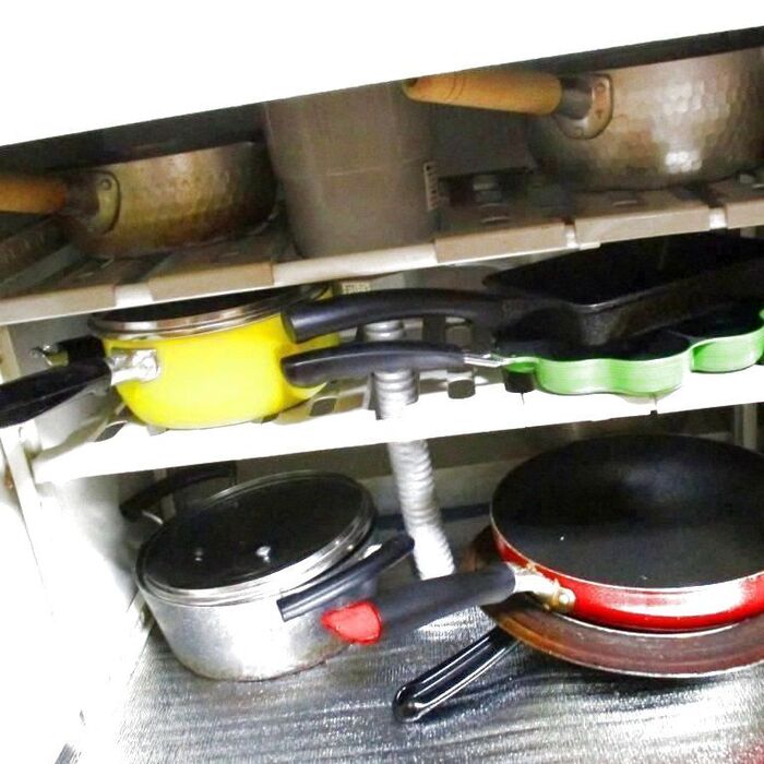 シンク下の鍋です、フライパンや鍋で頻繁に使うものを収納しています、鍋も買い替えの時期がきていますね(笑)