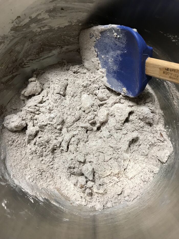 ③ボウルに〇粉類と塩を万能こし器などでふるい入れ、スケッパーやゴムベラで切り混ぜ、ひとまとめにします。