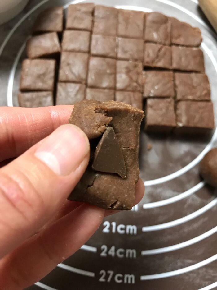 ⑥生地の真ん中にチョコレートをおき、キュキュっと丸ます。