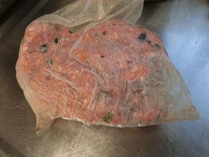 ポリ袋にひき肉、豆腐、ショウガを入れてよく混ぜ合わせます。