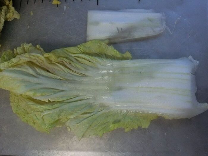 白菜はラップに包んで電子レンジで3~4分加熱し柔らかくします。白い茎の部分をそぎ切りにし、厚くなりすぎないようにします。