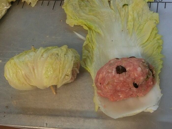 そぎ落とした白菜を細切りにし、8等分した肉だねと一緒に巻きます。巻き終わりをパスタで止めます。