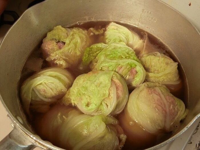 お鍋で煮るときは、出来るだけ小さめのお鍋にロール白菜を立てて入れ