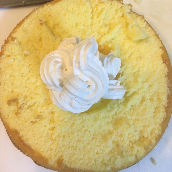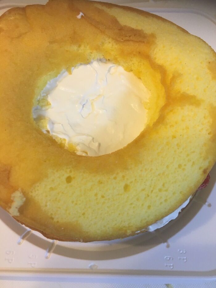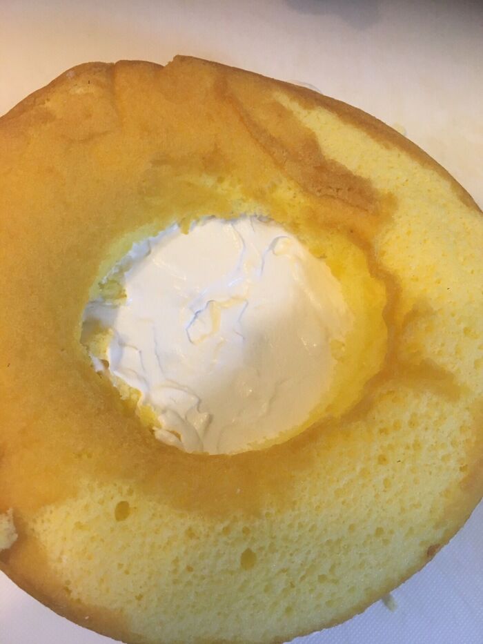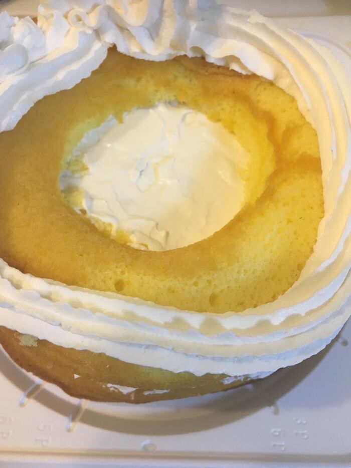 ⑤半分に切ったシフォンケーキの下の部分に、市販のホイップクリームをしぼる。