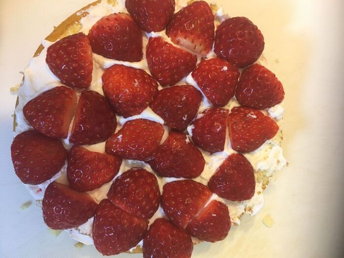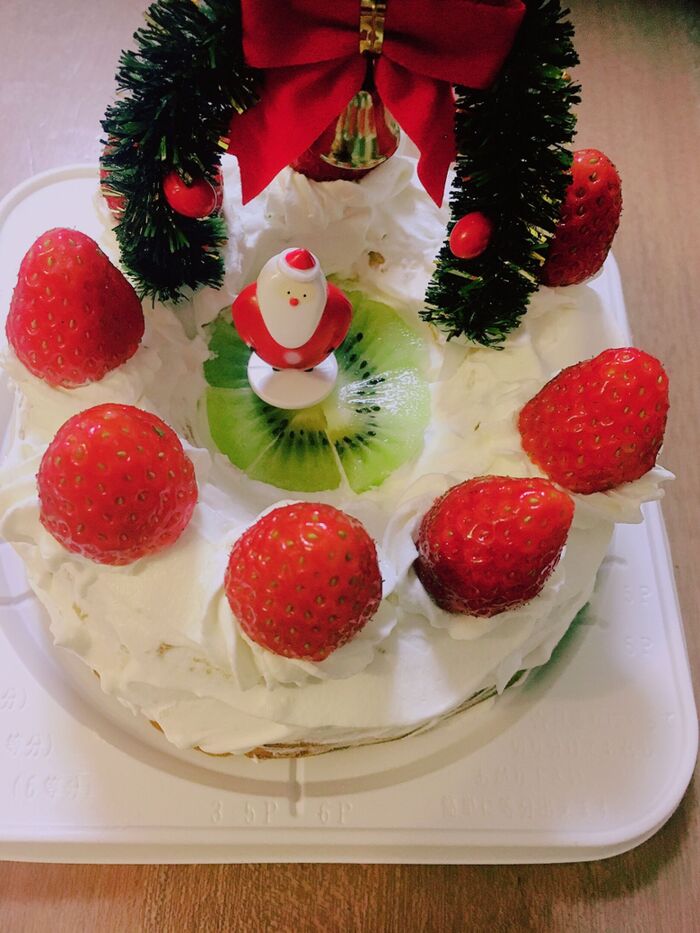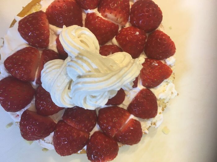 ⑮周りに、ホイップクリームをしぼって、いちごをのせ、デコレーションピックを飾って、出来上がり〜♪