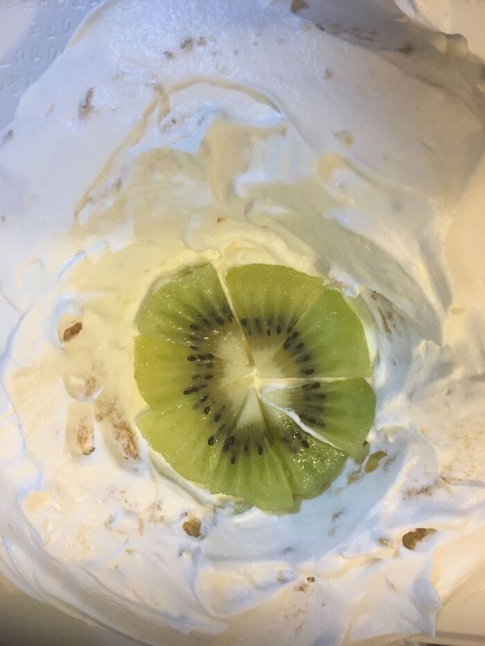 ⑭真ん中の凹んだ部分に、キウイを切って、のせる。