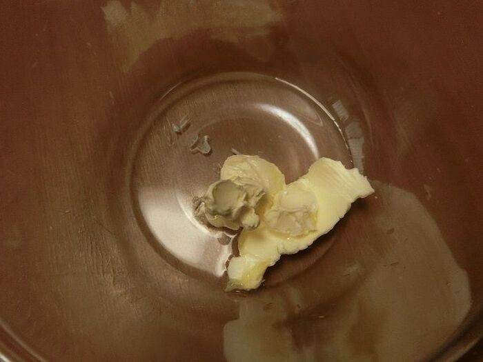 耐熱ボウルに水とバターを入れ、フタをせずに電子レンジ600wで2分加熱します。