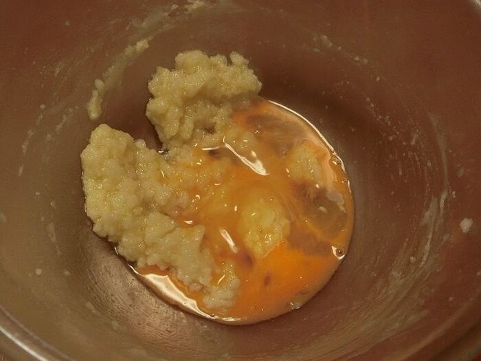 溶き卵を少しずつ入れてよく混ぜ合わせ、木べらから落とすとゆっくり落ちるくらいの固さにします。