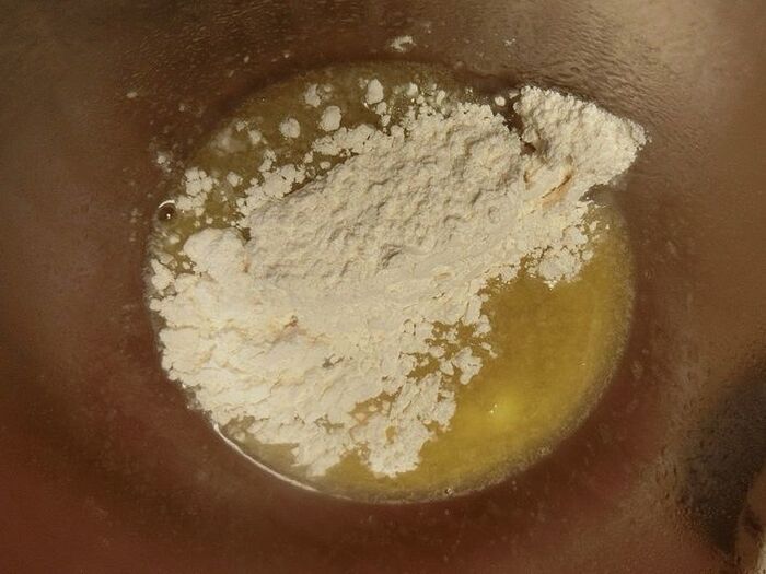 沸騰した所に薄力粉を一気に入れ、混ぜ合わせたらフタをせずに電子レンジ600wで1分加熱します。
