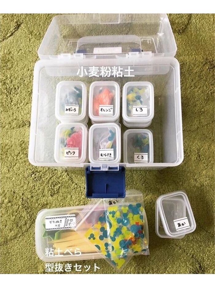 我が家では、乾燥防止のために小さめのジップロックに入れてから、小ぶりなサイズ(ダイソー)の容器に色ごとで分けて収納しています?
