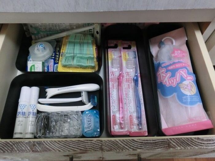 この中には、デンタルケア用品・髭剃り用品・歯ブラシのストック・泡立てネットなどを納めています。