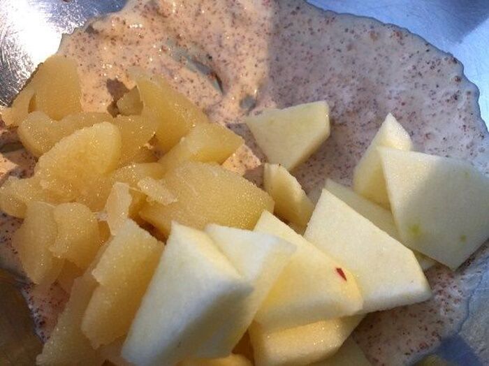 リンゴから水分が出てしまうので食べる直前に和えるようにします。