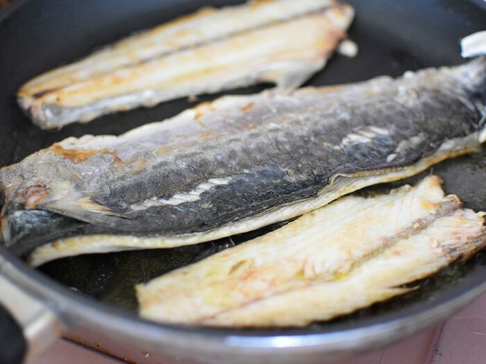 鮮魚屋さんで三枚おろしにしてもらったら、中骨と頭ももらって帰ります。