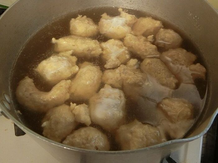 沸いたら2の肉だねをポリ袋の端を切って団子にしながら入れます。