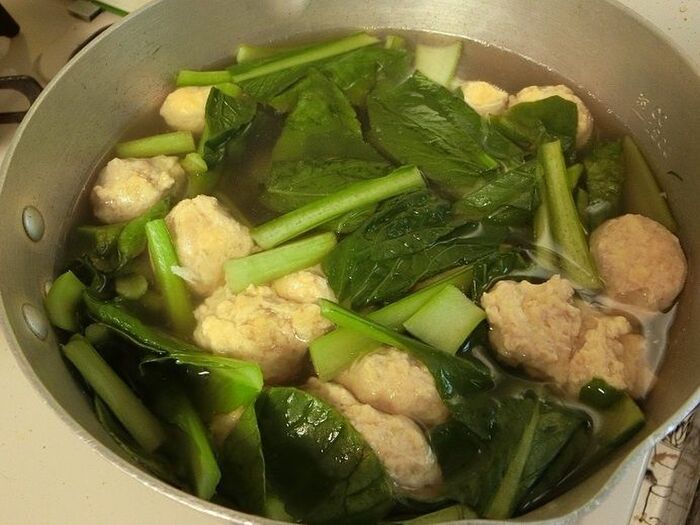 団子に火が通ったらあくをとり、春雨と小松菜を入れます。塩こしょうで味を整えたら完成♪