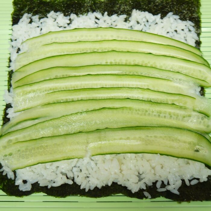 そして、ごはんの端同士をひっつけるように巻きます。手前ののりの端を奥側のごはんに合わせる感じです。