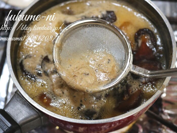 鍋に◎と戻したしいたけを入れて、煮汁が1/3量くらいになるまで煮詰める。