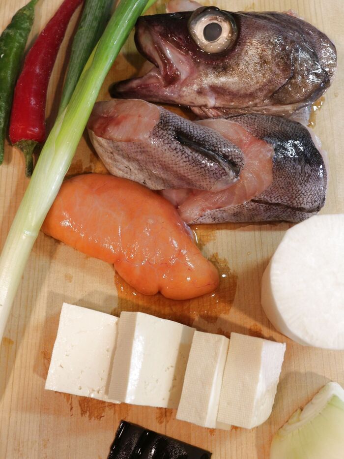 ①たらは水で洗って水気を拭き取る。大根はイチョウ切りに、豆腐は食べやすい大きさに切る。長ねぎや唐辛子は斜め切りに。生姜は薄切りに。