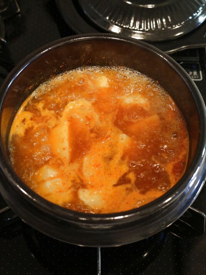 ③②に大根、玉ねぎを入れて2~3分煮立て、たらとたらこ、豆腐、生姜、長ねぎを入れてさらに5分ほど煮込むと出来上がり。