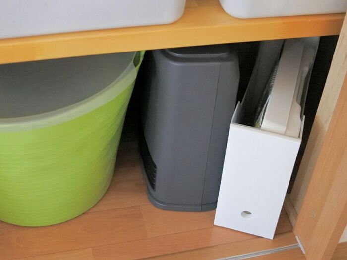 一番下は洗濯かご、ヒーター、一番奥にファイルボックスに体重計を入れて収納しています