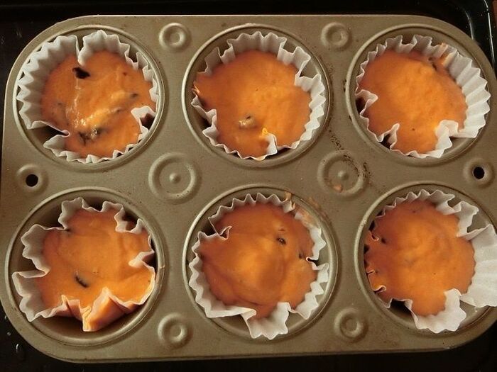 型に紙カップを敷いて、カップの8分目くらいまで生地を流し込みます。