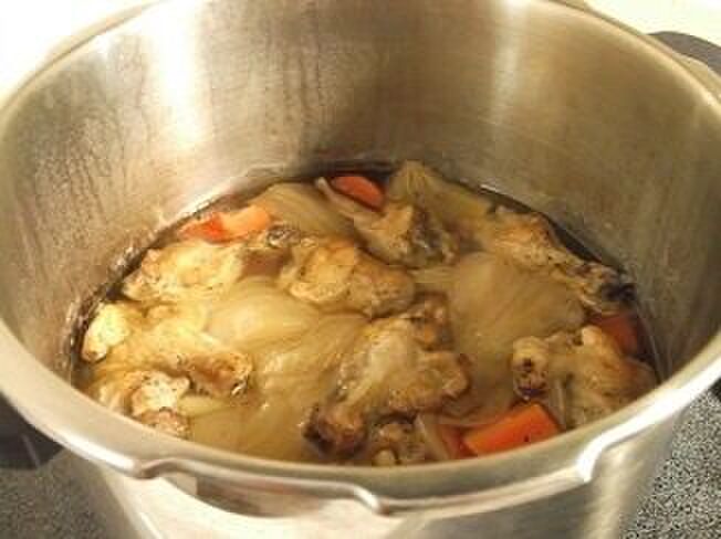 圧力鍋に②を入れ、蓋をして強めの中火にかける。
