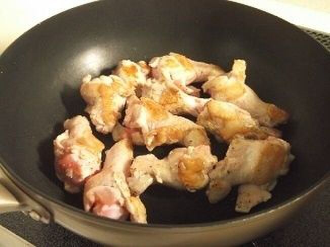 フライパンを中火にかけ、全体に焼き目を付ける。 (鶏の皮から脂が出るので、炒め油不要♪)