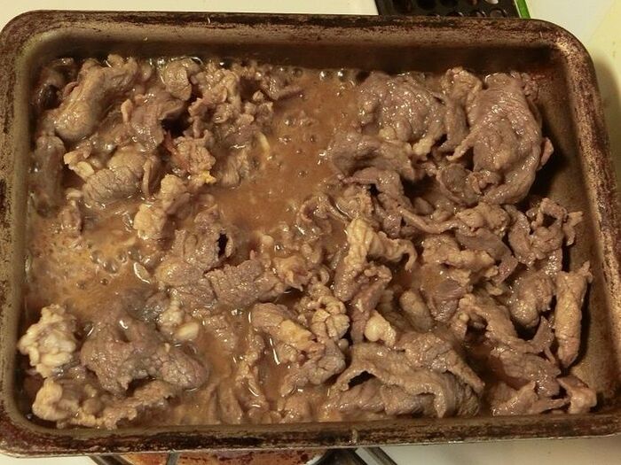 牛肉に☆印の調味料を混ぜ合わせます。10分くらい漬け込んだら、フライパンで炒めます。