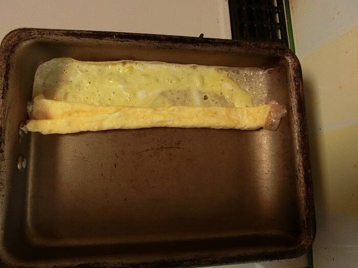 卵焼きはフライパンの長い方を使って作ると、ちょうどいい長さの卵焼きになります。