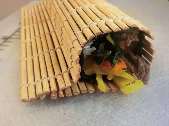 まきすをはずし、あまった海苔の方へ回転させたら完成★海苔がなじんでから切り分けます。