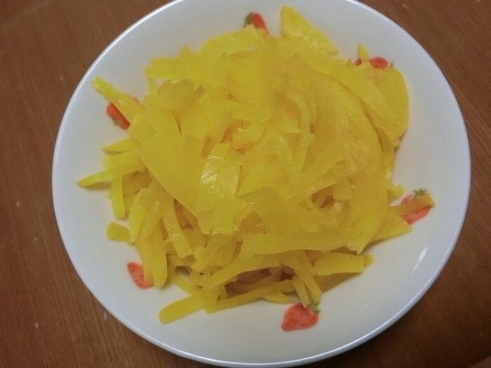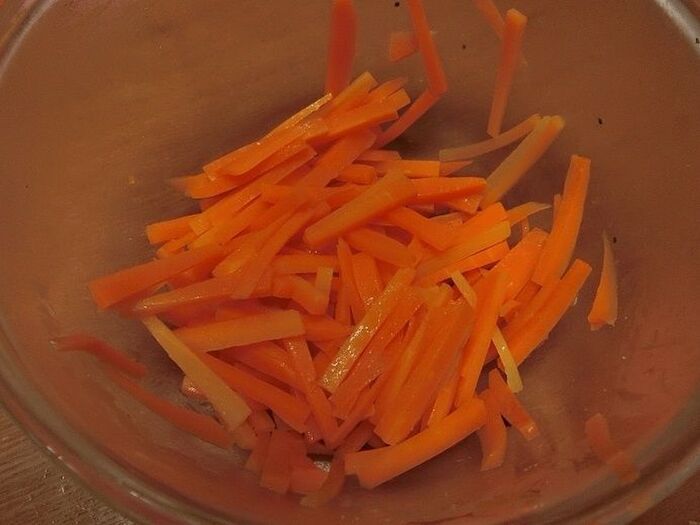人参は細切りにします。耐熱容器に入れて電子レンジ600wで2分加熱し、ごま油と塩を混ぜ合わせます。