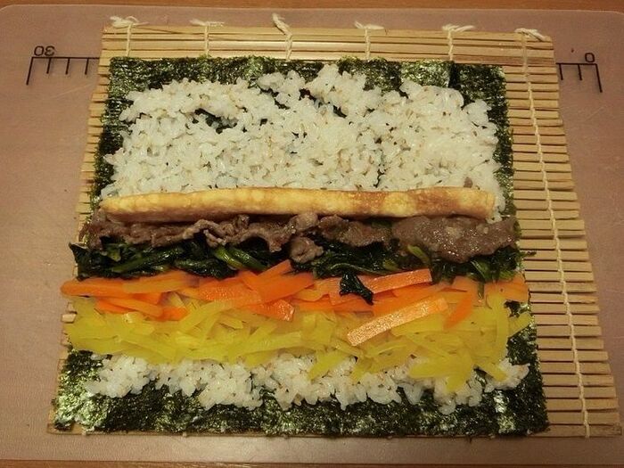 具の1/3量を乗せて、手前のまきすと海苔を一緒に持って、奥のご飯の端をめがけて巻きます。