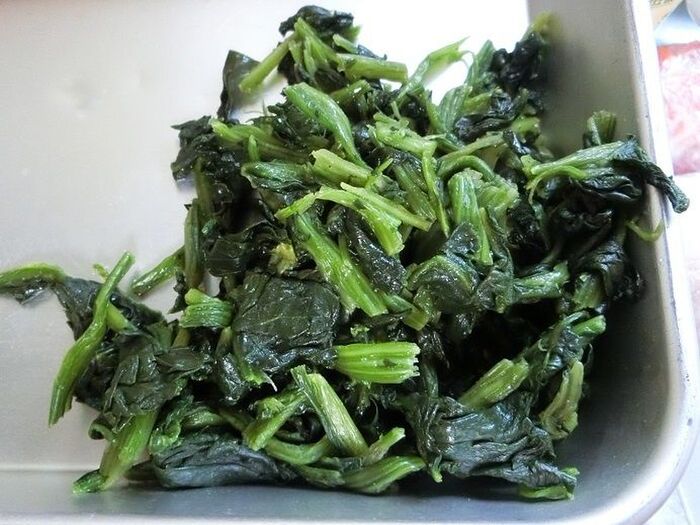 ほうれん草は5㎝の長さに切ります。耐熱容器に入れて電子レンジ600wで1分半加熱し、ごま油と塩を混ぜ合わせます。