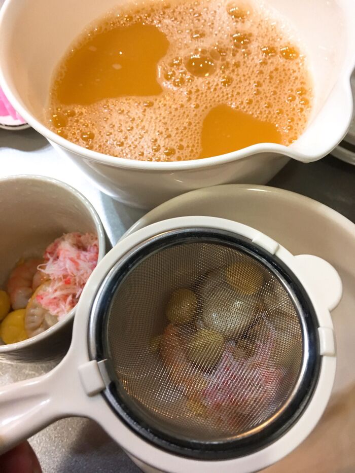 お好きな具を入れた器に茶こしを通して流し込みます。