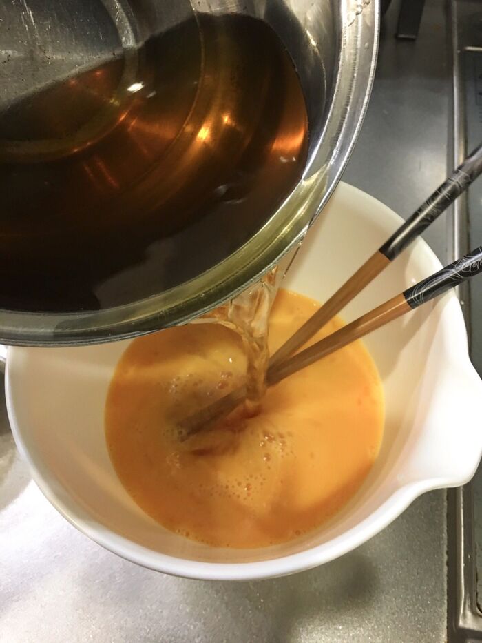 泡だてないように溶いた卵に出汁を少しずつ入れて優しく混ぜます。