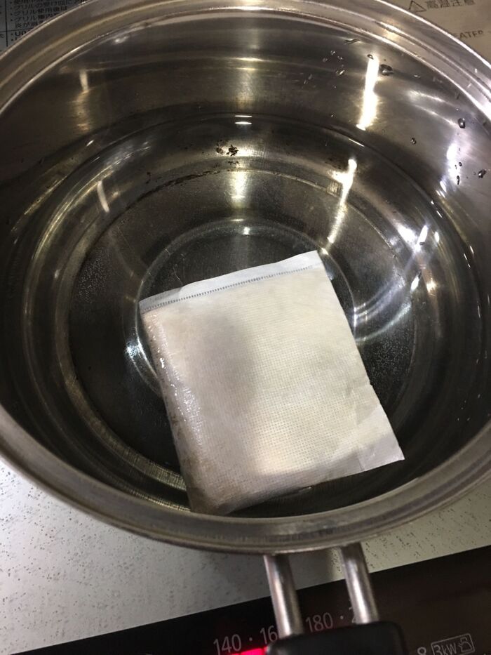 600ccの水に出汁パックを入れて火にかけます。