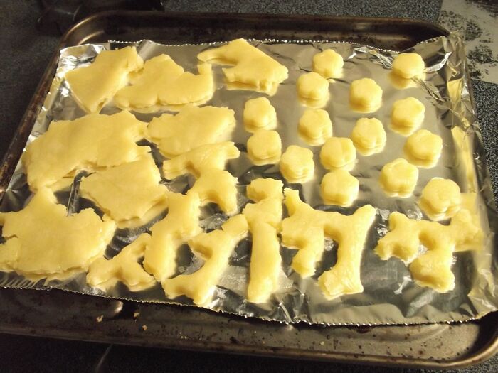 トースターの天板にアルミホイルを敷いて、抜いたクッキーを並べる。