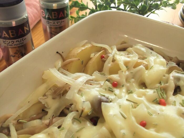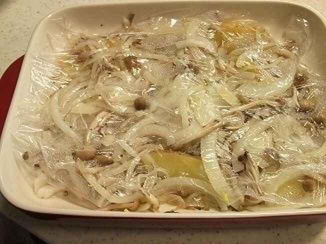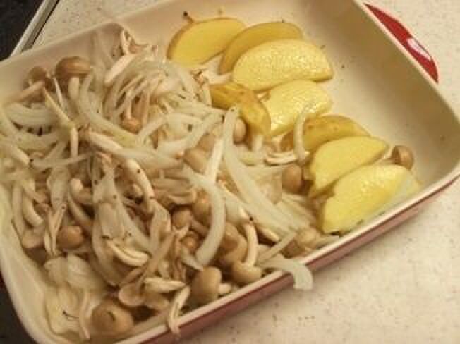 1.玉ねぎ&しめじに甘酢味を絡めて、じゃがいもを包むように蒸すこと。