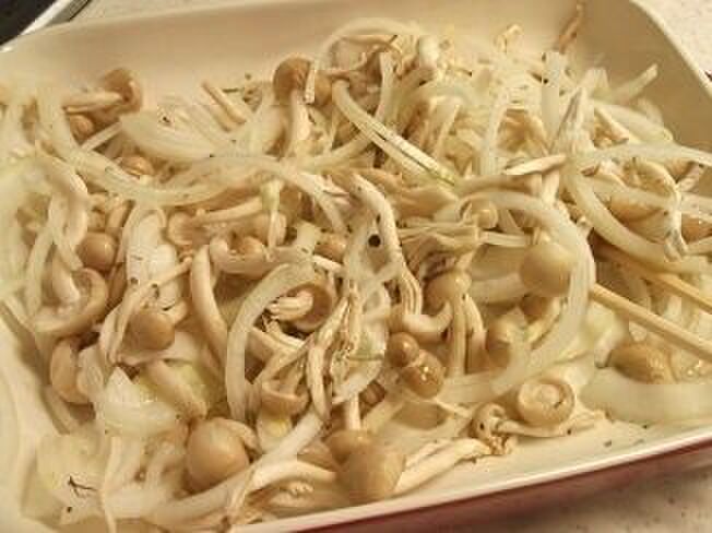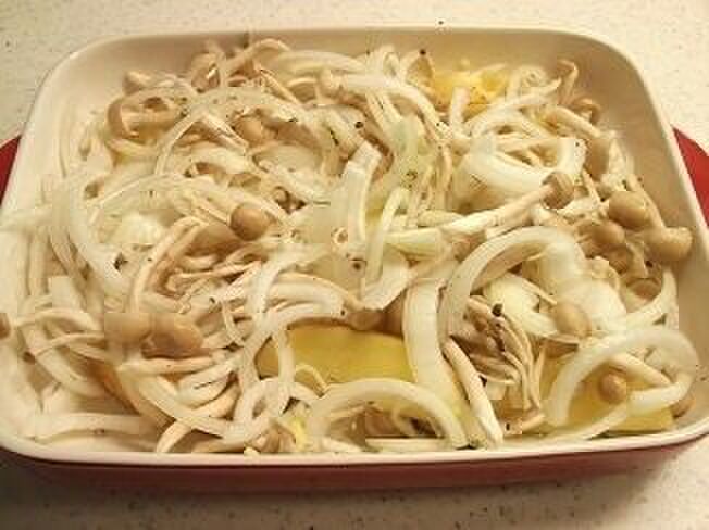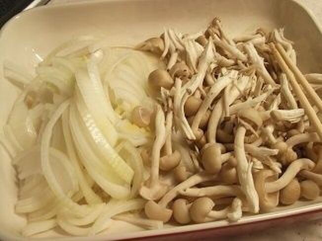 そこへ、横薄切りの玉ねぎと小房に分けたしめじを入れて