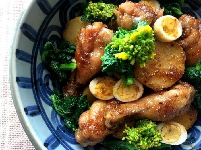器に盛り付け 茹でてごま油小さじ1をまぶしたなばなを添える
