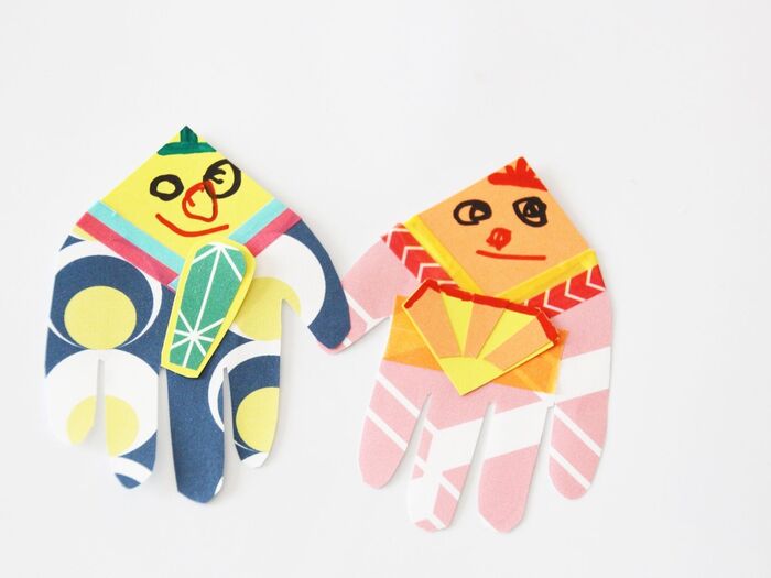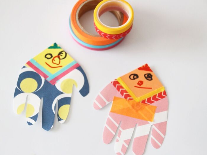 マスキングテープを羽織にみたてて手形と顔の境目に貼ります。