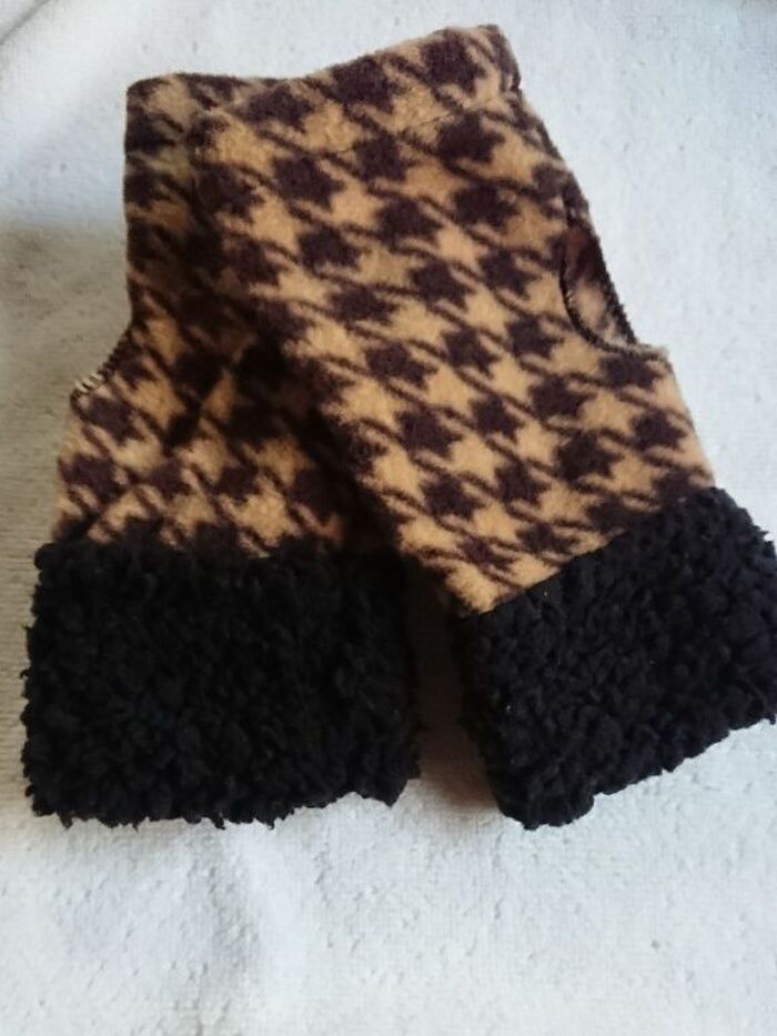 薄茶と焦げ茶の千鳥格子に、手首は黒いモコモコになっています。