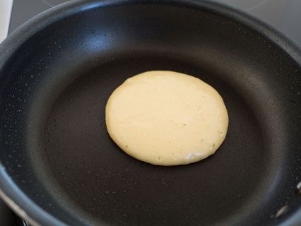 フライパンを弱火で温め、②の生地をお玉で流し入れ、適度な大きさに広げる。