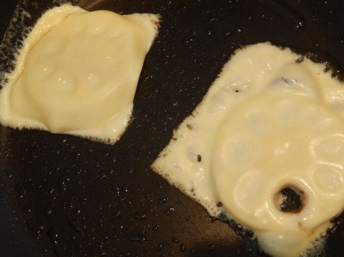 チーズをレンコンの上に1枚ずつのせ はみ出したチーズをレンコンにのせるように寄せ集めチーズがカリッとするまで焼き いったん取り出す