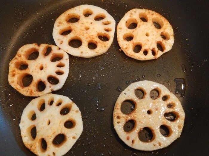 フライパンにオイル小さじ2を入れレンコンの両面をカリッと焼き 塩・コショウする