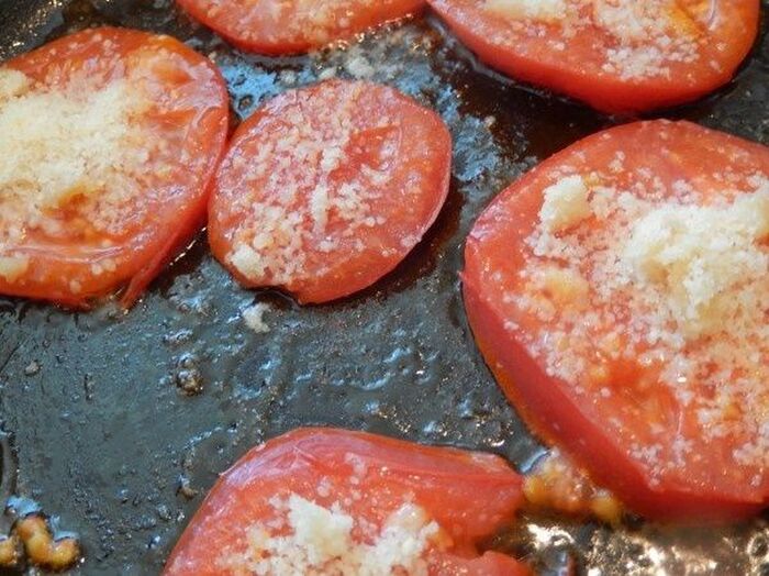 フライパンにオリーブオイル小さじ1とトマトを入れて焼き パルミジャーノをのせ蓋をしてチーズを溶かす