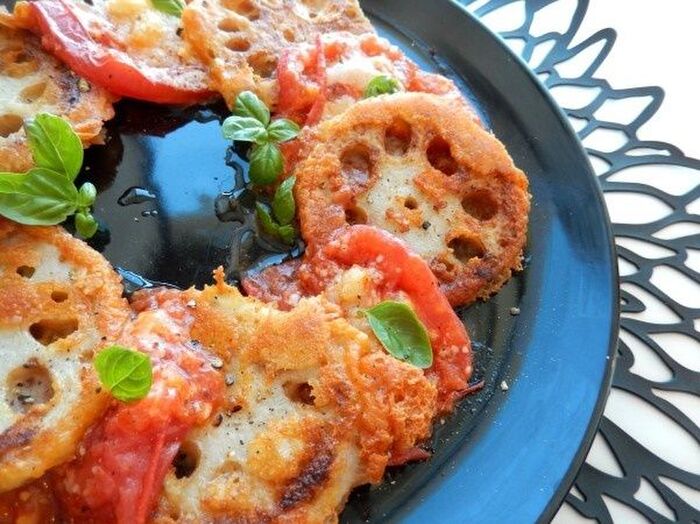 器にレンコンとトマトを交互に盛り付け バジリコを添える