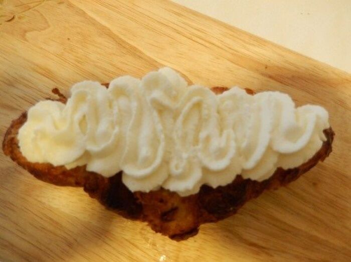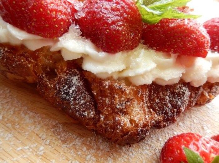 軽くオーブンで温めたクロワッサンの上部を切り中にクリームを詰めイチゴをのせる