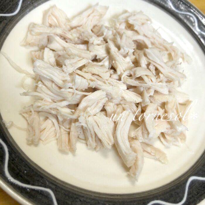 ササミはスジをとって、酒をかけてから軽くラップをして600Wで約1分半加熱し、あら熱が取れたらほぐしておく。